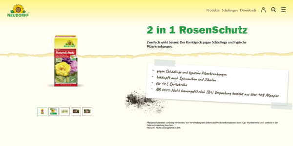 Besonders herausfordernd war dabei das Zusammenspiel aus gemeinsamen und individuellen Datenstrukturen der einzelnen Mandanten. Gleichzeitig sollte das Webdesign auf Basis von neudorff.de weiterentwickelt und für den B2B-Bereich passgenau adaptiert werden.